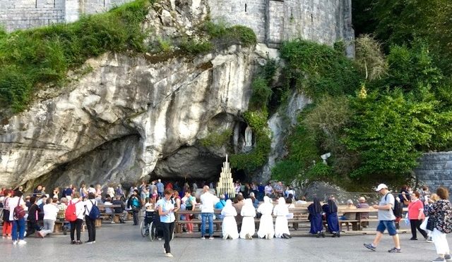 Lourdes ! Sa gare, ses maisons, ses magasins, ses foules… toute cette théâtralité pourrait nous effrayer, nous induire en erreur, nous écarter de ce lieu béni, et pire : ébranler notre foi parfois si fragile ! Mais heureusement l’essentiel n’est pas là. Un peu à l’écart du tumulte de la ville près du Gave se trouve une Grotte où en 1858 une » très Belle Dame » est apparue à une adolescente ne sachant ni lire ni écrire.